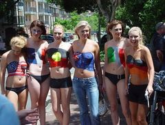 • Camouflage body art where the bodies are blended into backgrounds and then appear or are painted as a logo or objects (This can be used in multiple bodies forming an image or themed design)