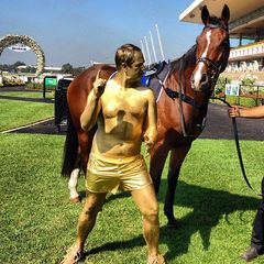 The golden bodypaint is being used to help give Wippa an advantage in his race against a racehorse.