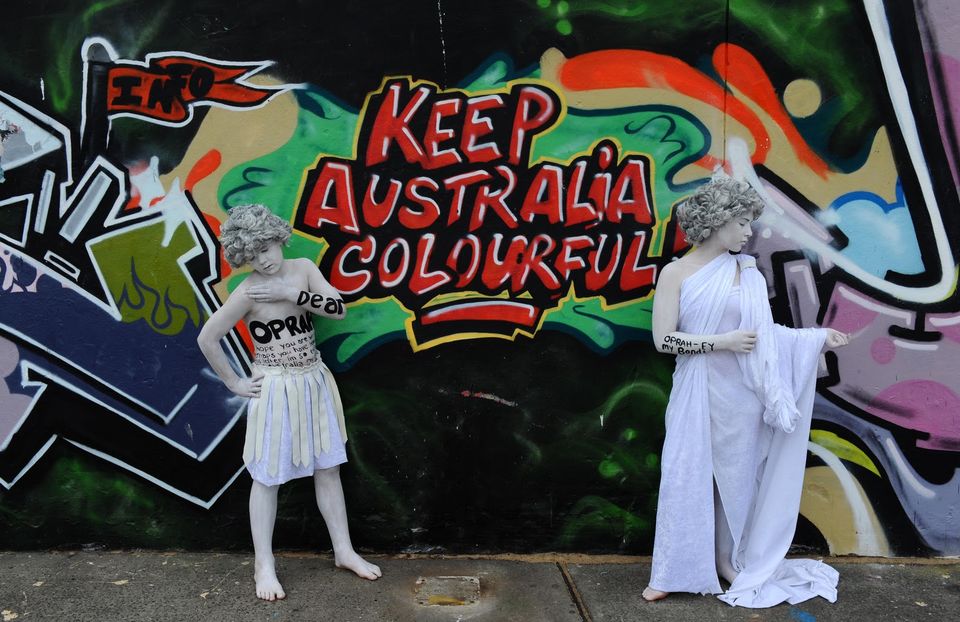 AN Australian artist will ask American TV talk show queen Oprah Winfrey to strip off and have her body painted for charity when she comes Down Under in December.